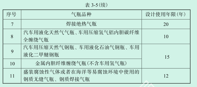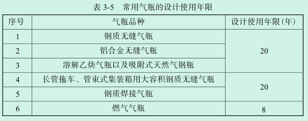 制造單位應(yīng)當(dāng)明確氣瓶的設(shè)計使用年限,并且在設(shè)計文件和制造標(biāo)志上注明。氣瓶瓶體的實際使用年限應(yīng)當(dāng)滿足表3-5的規(guī)定,表3-5中未列入的氣瓶設(shè)計使用年限應(yīng)當(dāng)在相應(yīng)產(chǎn)品標(biāo)準(zhǔn)中做出規(guī)定。如果氣瓶制造單位在出場的氣瓶上刻印或壓鑄充裝單位標(biāo)志并裝設(shè)可追溯的電子識讀標(biāo)志,充裝單位能夠確保氣瓶始終處于良好的維護(hù)保養(yǎng)狀態(tài)并通過安全評估,鋼制無縫氣瓶或者鋁合金氣瓶的實際使用年限可以延長至30年,燃?xì)鈿馄康膶嶋H使用年限可以延長至12年。